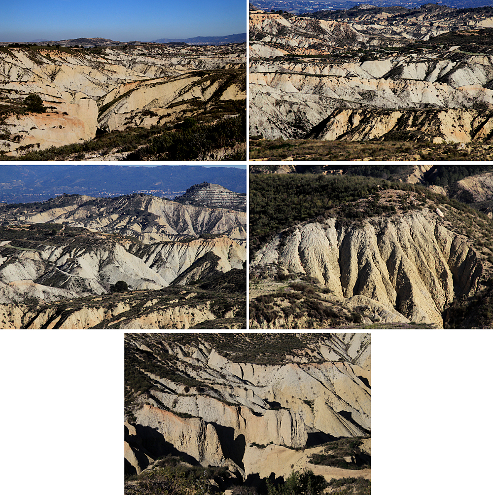 Después de comer, vamos a los Badlands de Gebas, un espectacular paisaje árido de 2.271 hectáreas. Hace aproximadamente entre 5 y 7 millones de años (en el Mioceno superior), toda esta zona estaba sumergida bajo el mar, en cuyo fondo se depositaron los sedimentos que hoy vemos. El fondo marino quedó al descubierto cuando el Mediterráneo se desecó parcialmente, hace entre 5,96 y 5,33 millones de años. Luego, el agua de la rambla de Algeciras fue erosionando estos sedimentos y formando las cárcavas que vemos actualmente.