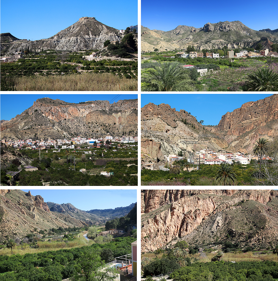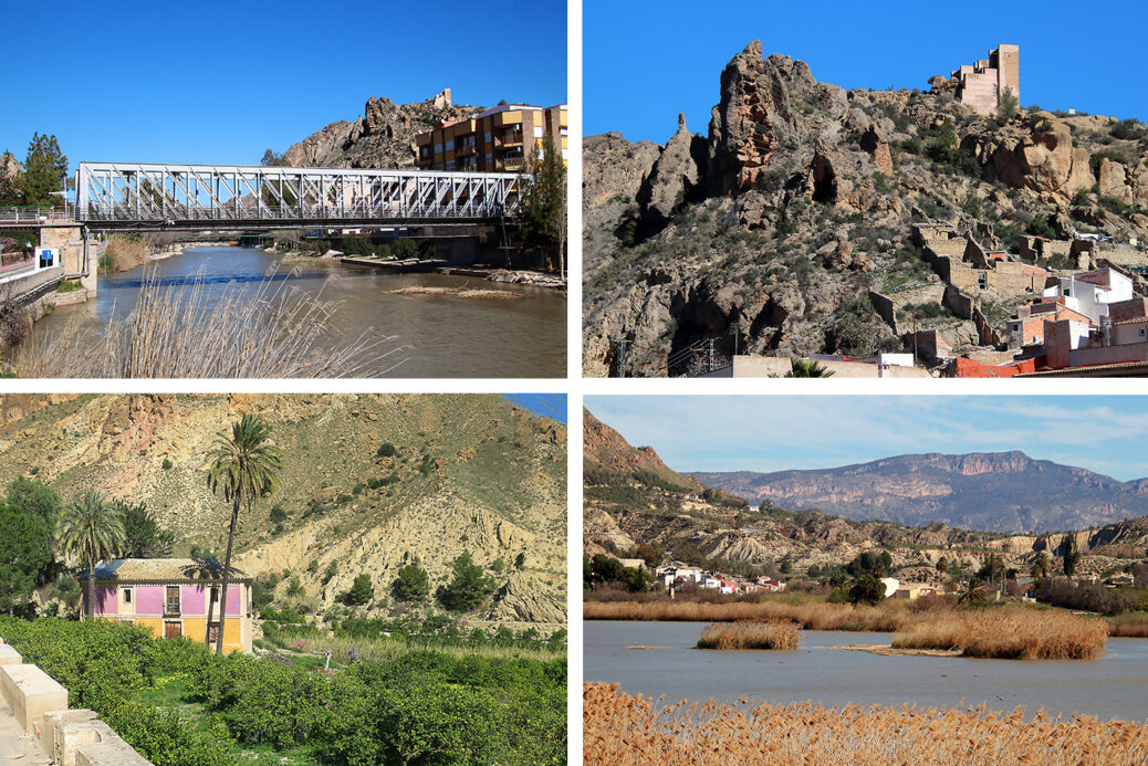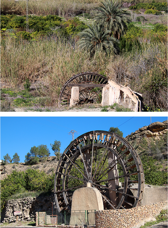 y en el aspecto de las huertas, regadas por el río Segura con el sistema de acequias y norias que permiten el regadío por gravedad.