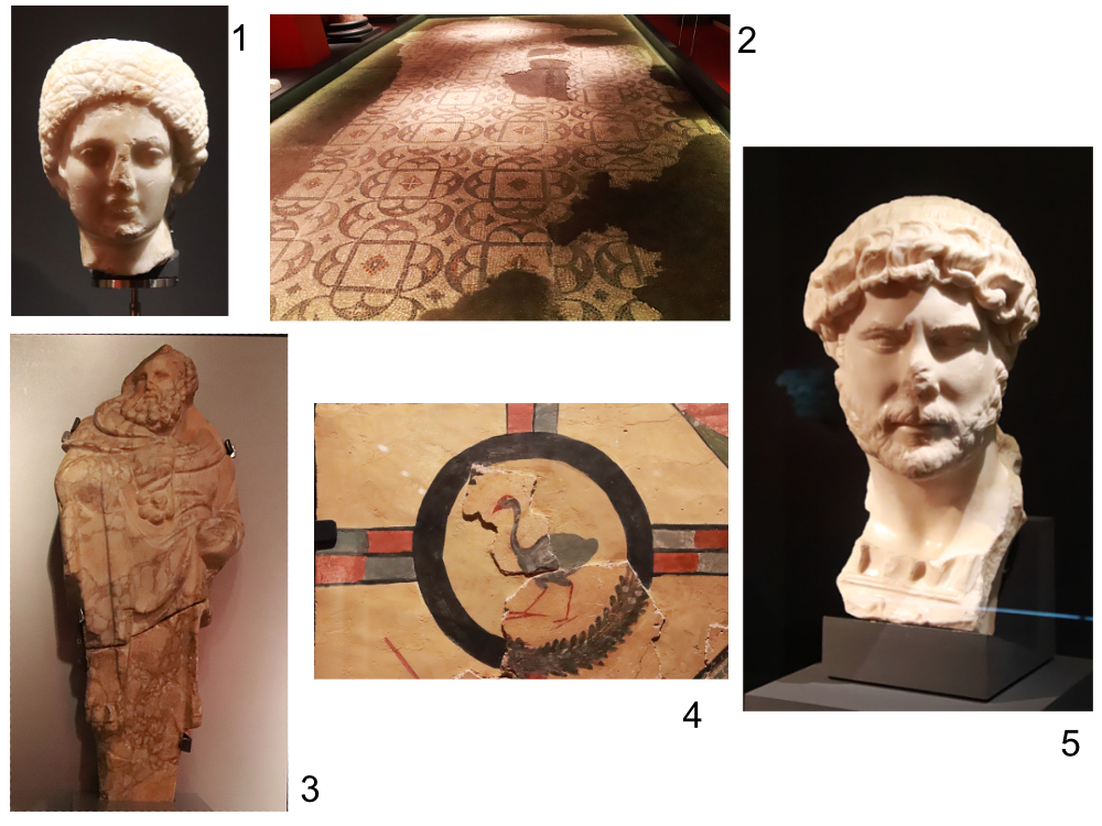 El yacimiento romano de Los Torrejones está bien representado en el museo: Cabeza de mujer (1), mosaico (2), estatua de Hércules (3), pinturas de las paredes, de las que me llamó la atención la representación del calamón común (Porphyrio porphyrio), un ave muy bonita (4) y un magnifico retrato del emperador Adriano hecho con mármol de gran calidad (5).