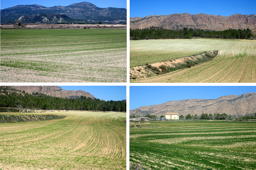 También hemos visto campos de secano con cultivos herbáceos, pero casi acaban de brotar y no podemos saber exactamente qué son. Busco información y leo: «La cebada es el cereal más extendido con 51.175 ha. El predominio de sembrados, se encuentra en Caravaca, Moratalla,…», pienso, entonces, que puede ser cebada.
