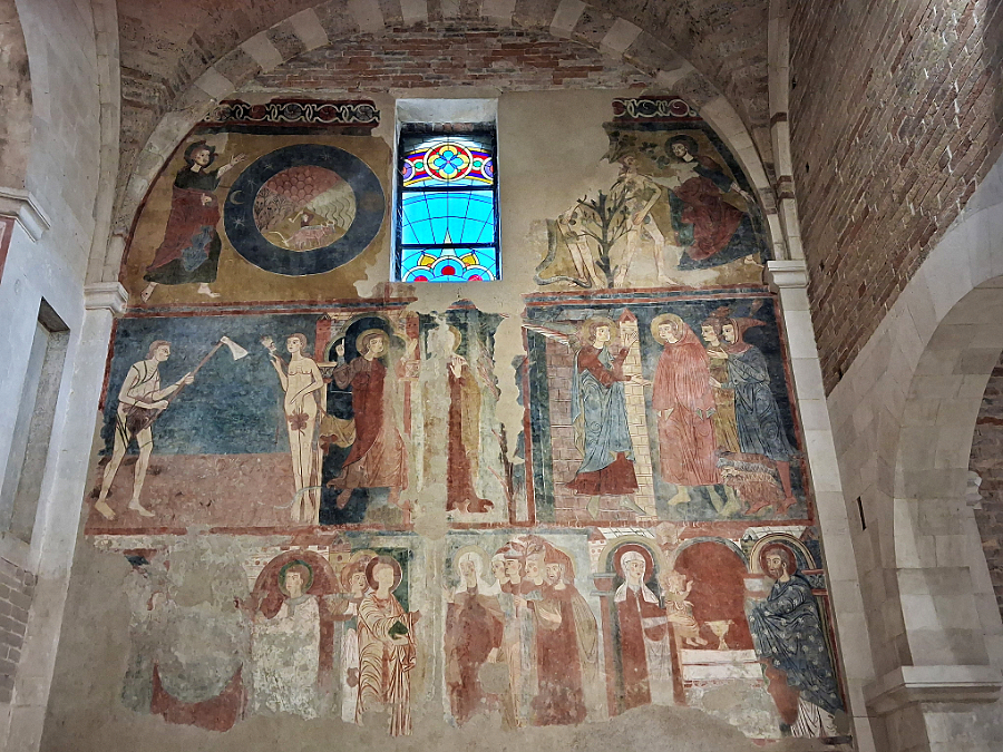 En la pared del transepto derecho se representan escenas del Antiguo Testamento, como la Creación y la Expulsión del Paraíso. A Joan le encantó la figura de Adán con un hacha de hierro en la mano ¡ya conocía la metalurgia del hierro!