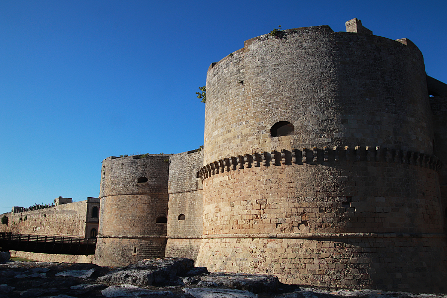 Ponemos dirección a Otranto. Queríamos instalarnos en el camping, pero estaba lleno, así que fuimos al parking Via Orte, donde comimos. Luego salimos a pasear por la ciudad. Primero fuimos hasta el castillo, que es el resultado de numerosas remodelaciones. No se sabe la fecha de su creación, pero se tiene noticia de que ya en el siglo XI existía un castillo. Por Otranto han pasado bizantinos, normandos, el Sacro Imperio, franceses, aragoneses, turcos y españoles; todos ellos realizaron modificaciones en él. Las últimas remodelaciones se hicieron en el siglo XIX.