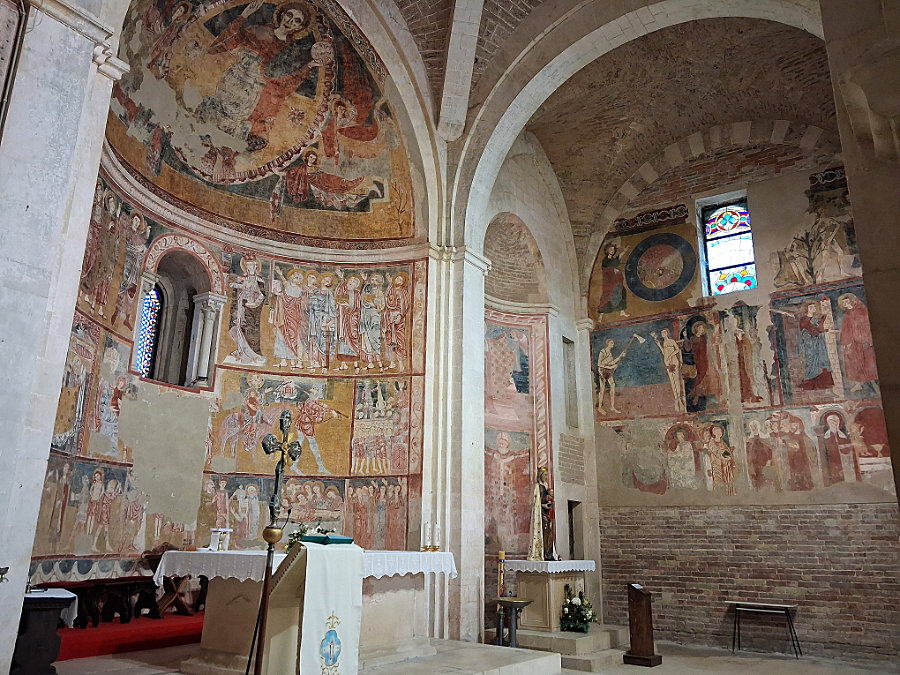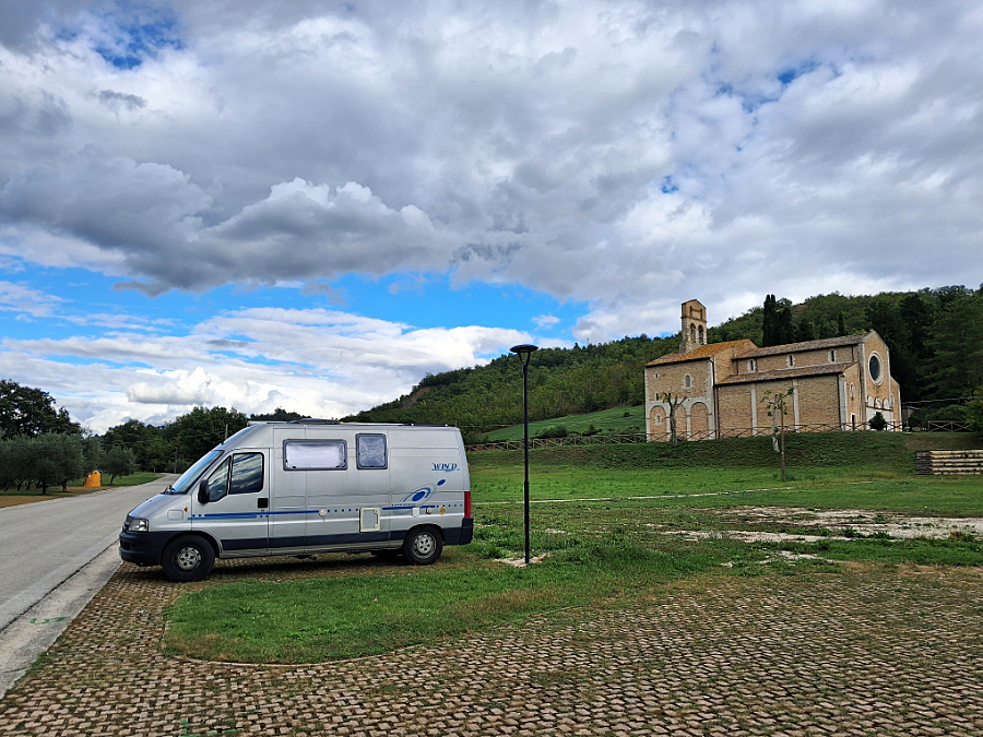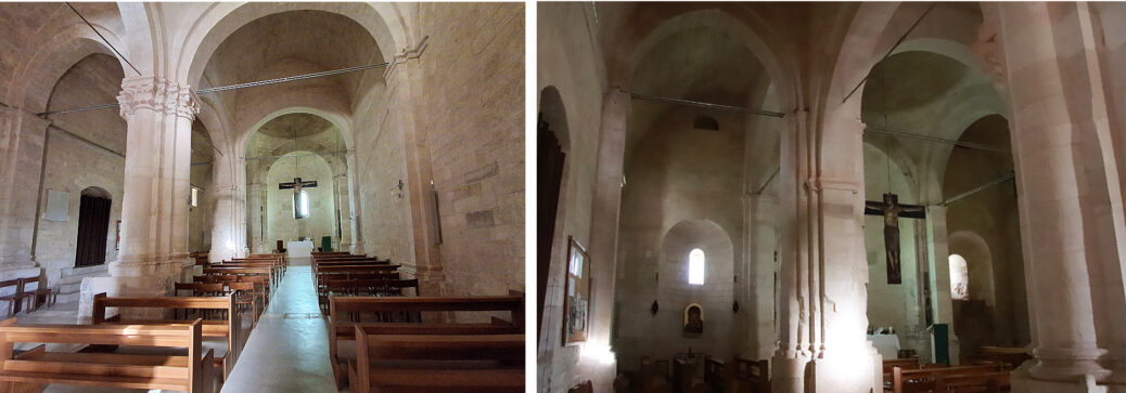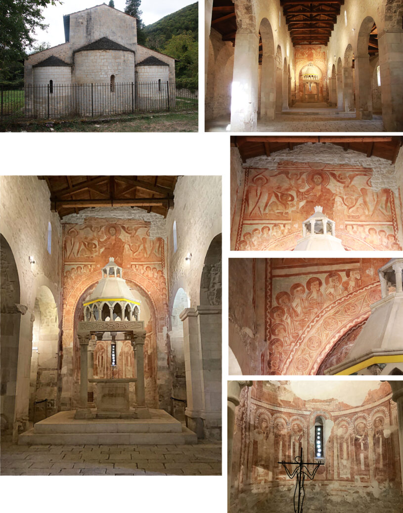 Hemos dormido muy bien en el área L’Olimpo, por la mañana hacía bastante fresco. El plan de hoy es ver tres iglesias románicas. Retrocedemos algo más de 40 km para ver la Abbazia di Sant Pietro ad Oratorium, fundada en el siglo VIII y reconstruida en estilo románico entre finales del siglo XI y principios del siglo XII. Llegamos y está cerrada, llamo por teléfono y me dicen que enseguida llegará el vigilante. Cuando llega vemos la iglesia.