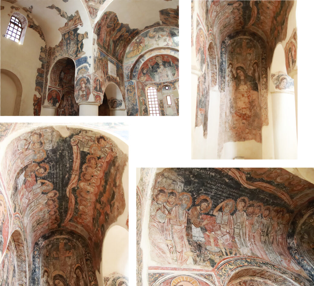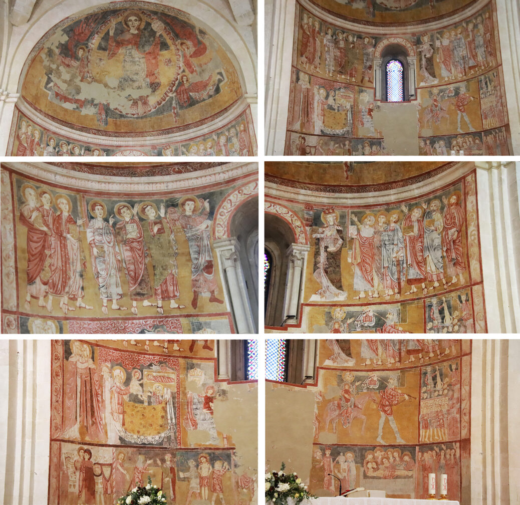Los del ábside central, datados alrededor de 1181, se organizan en tres registros: en el superior, Cristo en Majestad (Pantocrátor) dentro de una mandorla, sosteniendo un disco con la inscripción Ego sum lux mundi (Yo soy la luz del mundo) y rodeado de ángeles; en el registro siguiente aparecen los doce apóstoles y una escena de la Anunciación; y en los registros medio e inferior se representan escenas del Nuevo Testamento: la Visitación, la Natividad, la Adoración de los Magos, la Huida a Egipto, la Pasión de Cristo y la Deposición en el sepulcro
