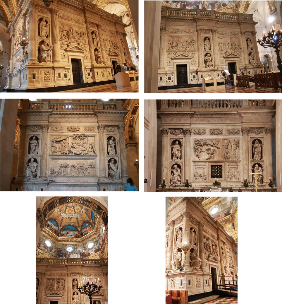 La ejecución de los relieves que cubren la Santa Casa fue un trabajo colectivo que duró varias décadas (de 1509 a 1587) e involucró a los mejores escultores de la época, incluyendo a Andrea Sansovino, Francesco da Sangallo, Giovanni Battista della Porta y otros; por lo que tenemos relieves tanto cinquecentistas como manieristas, pero el diseño general de Bramante unificó la obra. La temática se centra en los orígenes y la vida de la Virgen María.