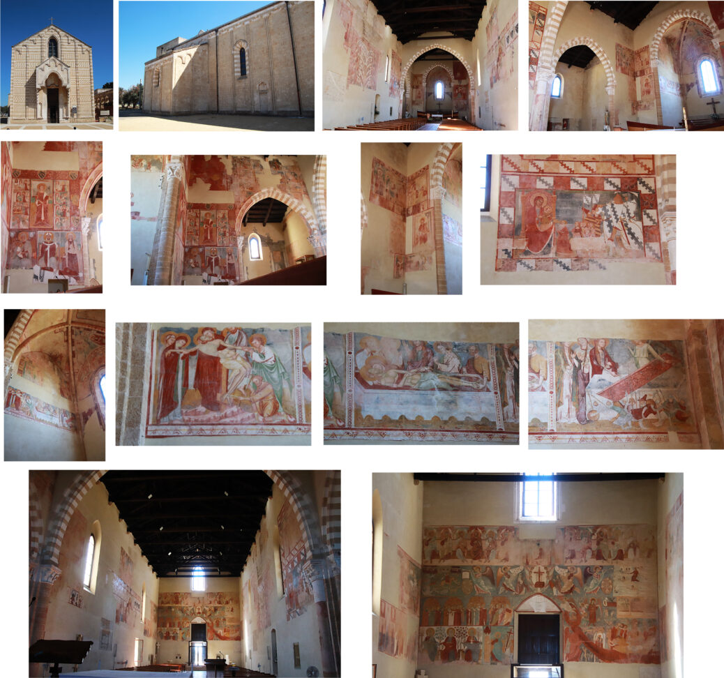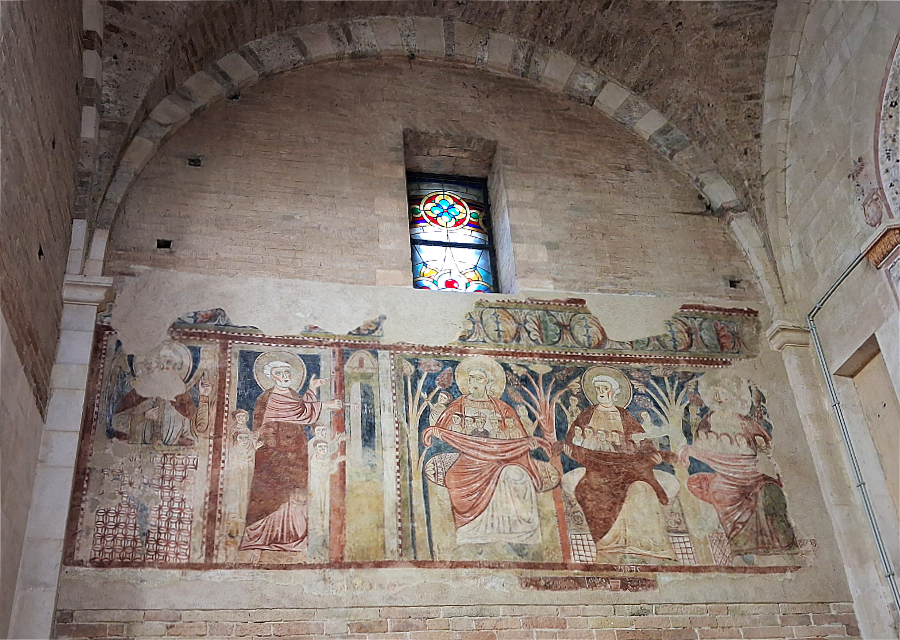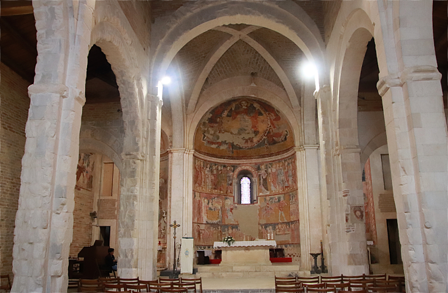La iglesia es de tres naves separadas por arcos de medio punto sobre pilares cuadrados, la cubierta es de madera. Cada nave termina en un ábside de planta semicircular. En el ábside central se conservan unos frescos del siglo XII que representan a Cristo (sin mandorla) con el Tetramorfos y dos serafines (tienen seis alas). Y, en un registro inferior, y siguiendo el trazado del arco de medio punto, están los Veinticuatro Ancianos del Apocalipsis. Su presencia alrededor de Cristo en Majestad crea una escena teológica completa: Cristo es el Juez y Rey Universal, adorado por la totalidad de su Iglesia, representada por los Ancianos y proclamada por los cuatro Evangelios, representados por el Tetramorfos.