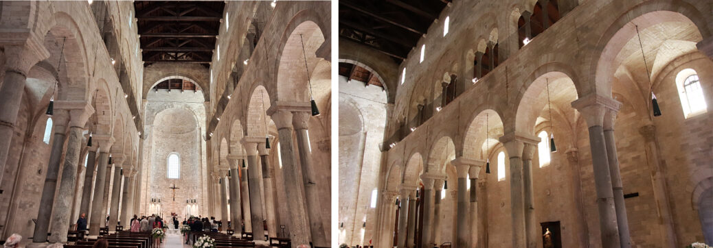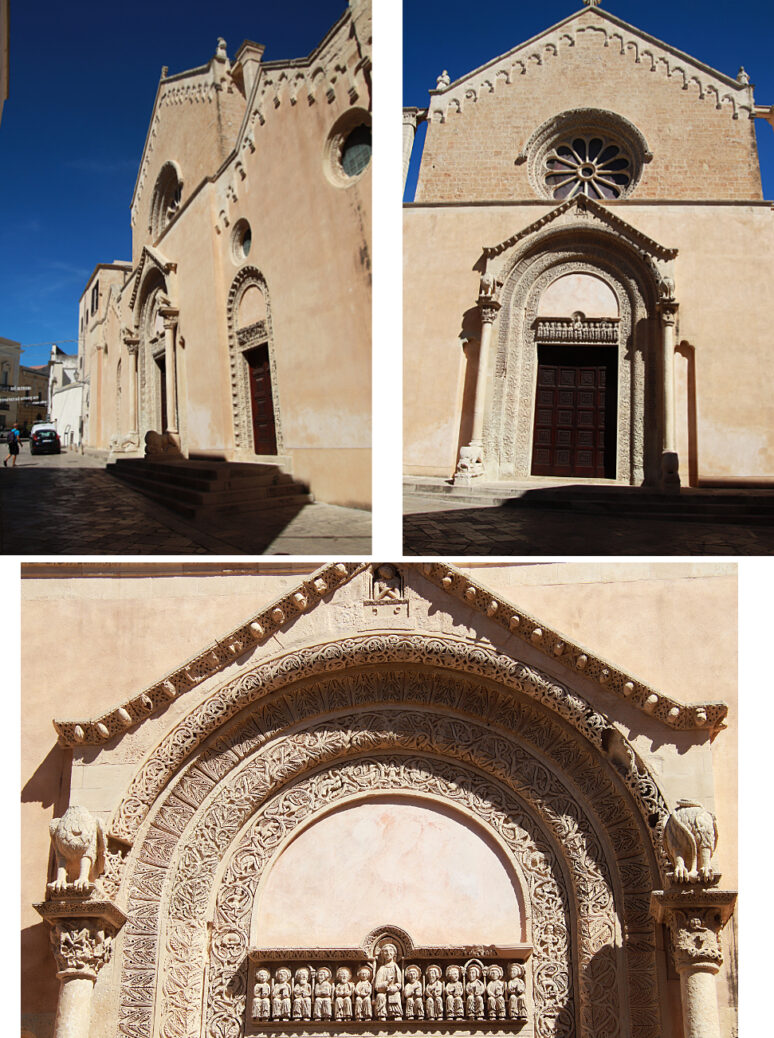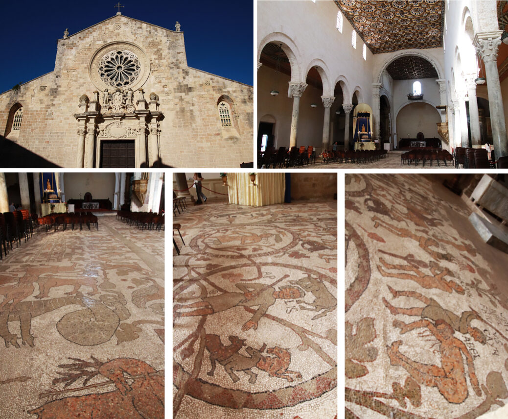 Seguimos hasta la Catedral de Santa Maria Annunziata, que fue construida entre 1080 y 1088 (después de que los normandos conquistaran la región a los bizantinos) sobre los cimientos de una iglesia paleocristiana; de hecho, el aspecto de su interior recuerda mucho a una basílica. El resultado es una mezcla de estilos: románico, bizantino y gótico. Pero lo más destacable es el gigantesco mosaico (1163-1166) que cubre todo el suelo. Es obra de un monje llamado Pantaleone y representa un «árbol de la vida» que une todas las escenas: escenas del Antiguo Testamento (como la historia de Adán y Eva, Caín y Abel, la Torre de Babel o el Arca de Noé), de la mitología clásica (como el rey Arturo y Alejandro Magno), los signos del Zodíaco, los meses del año, trabajos agrícolas y bestiarios medievales (animales reales y fantásticos). Se cree que representa el viaje del alma humana desde el pecado original hasta la salvación.