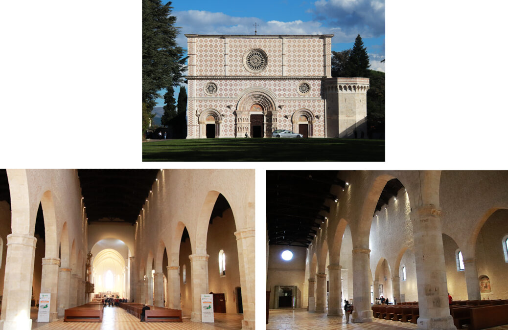 Nos instalamos en el área l’Olimpo en L’Aquila. Comemos y luego vamos a ver la Basilica di Santa Maria di Collemaggio. Fue fundada en 1288 pero ha sido remodelada varias veces a lo largo de los siglos, especialmente por los daños causados por los frecuentes terremotos, y presenta una mezcla de diferentes estilos arquitectónicos.