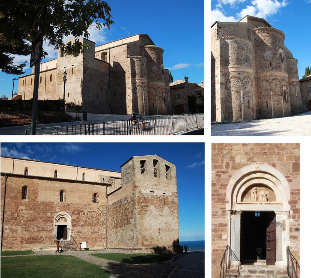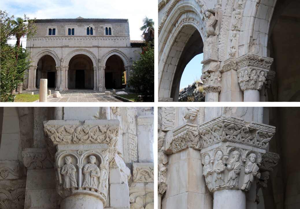 Vamos primero a la abadía de San Clemente a Casauria. La abadía fue fundada en 871, sufrió varios saqueos y destrucciones a lo largo de su historia y fue reconstruida y consagrada nuevamente en la primera mitad del siglo XII; el resultado es, en gran medida, lo que observamos hoy día. La planta es basilical de tres naves. La fachada es una obra maestra del arte románico. Está precedida por un pórtico con tres arcos que corresponden a tres portadas que dan acceso a las naves del templo. Fue el abad Leonate (1176-1182) quien inició la construcción del pórtico. Su intención era crear una entrada triunfal a la basílica que fuera una demostración explícita de la historia y el poder de su comunidad.