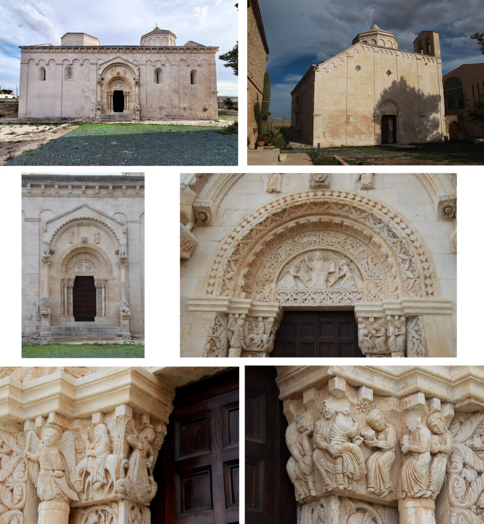 La Basílica di San Leonardo di Siponto fue fundada a principios del siglo XII y estuvo bajo la administración de varias órdenes religiosas hasta el cierre definitivo del hospital en 1809. A lo largo de su historia ha sufrido diversas remodelaciones. Tiene una de las portadas más interesantes del románico de la Puglia. Destaco los capiteles que soportan el dintel: el de la izquierda representa, de adentro hacia afuera, al arcángel san Miguel que atraviesa a un dragón con una lanza, y a un peregrino a horcajadas sobre un asno que, al ver al ángel con una espada, inclina la cabeza. En el capitel de la derecha, la Epifanía, pero los tres Reyes Magos no llevan corona.