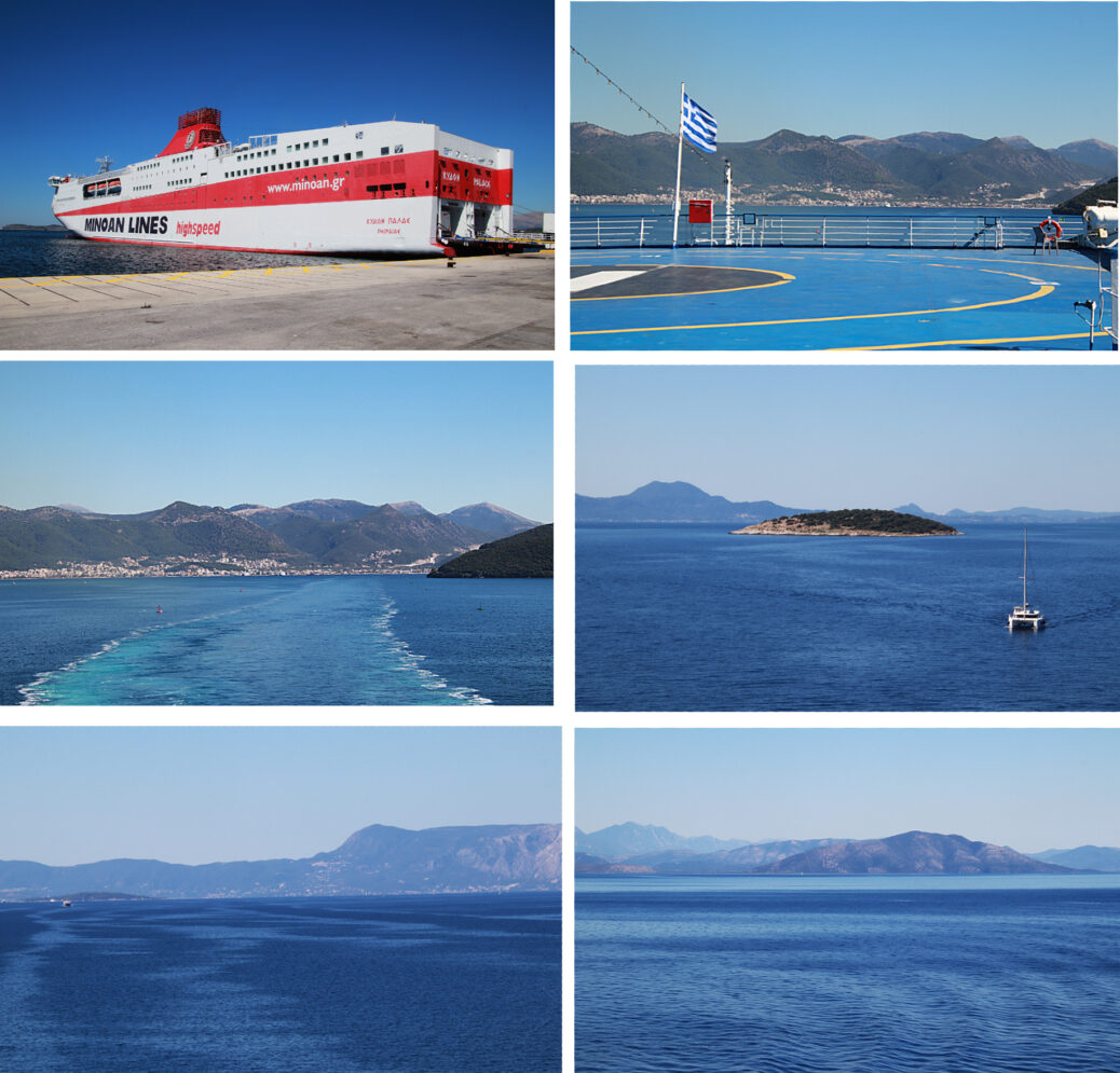 A media mañana nos dirigimos al puerto, porque el ferry de Grimaldi Lines sale a las 14 horas y hay que embarcar al menos dos horas antes. Salimos puntuales. Es la cuarta vez que cruzamos el Adriático, pero las tres anteriores lo hicimos de noche; esta vez pasamos una plácida tarde de domingo navegando por ese mar, disfrutando de sus maravillosos azules y de la navegación, viendo Corfú a un lado y Albania al otro. Ha sido una buena idea hacerlo a estas horas.