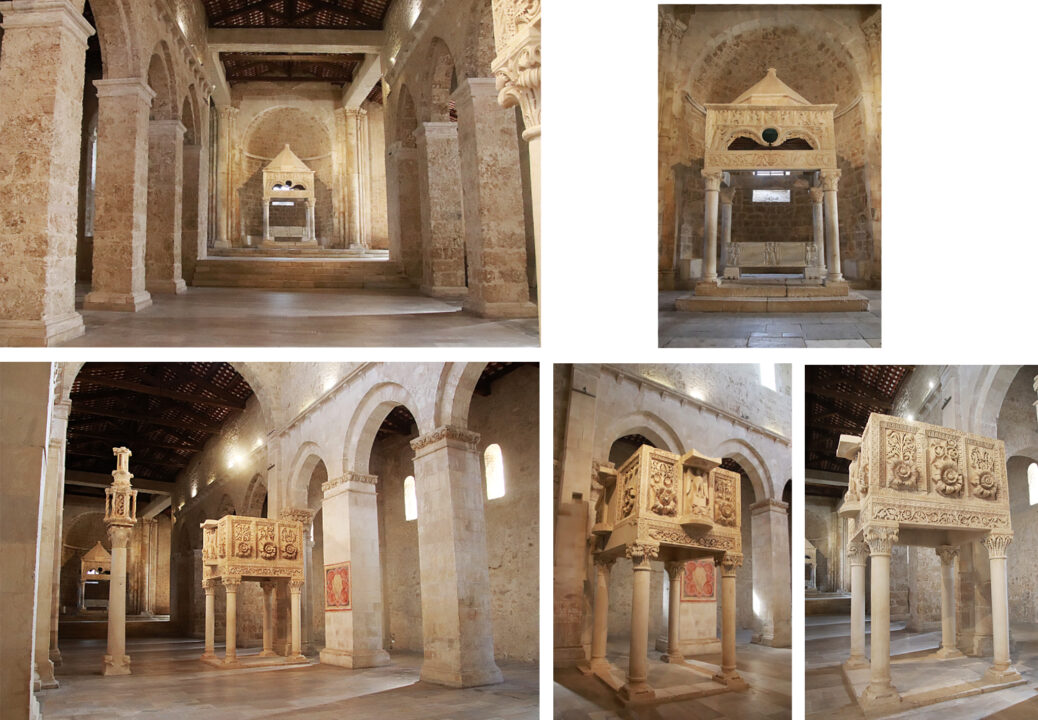 El altar mayor está cubierto por un baldaquino del siglo XIV (aproximadamente del año 1372), que es ya de estilo gótico. Bajo el baldaquino se encuentra el sarcófago que contiene las reliquias de San Clemente; se trata de un sarcófago paleocristiano del siglo IV que, además de relicario, funciona como el altar del templo. A mitad de la nave central encontramos el púlpito románico, ricamente decorado, realizado en la segunda mitad del siglo XII durante las importantes obras de renovación impulsadas por el abad Leonate. Enfrente del púlpito está el candelabro pascual.