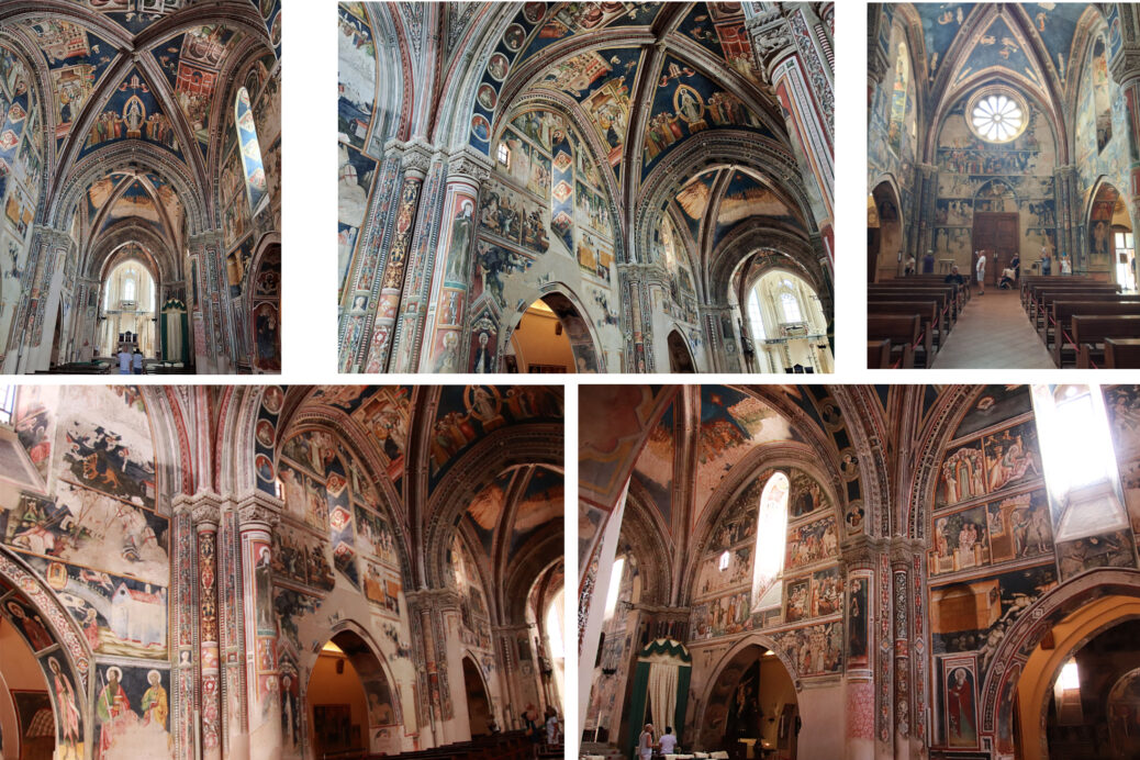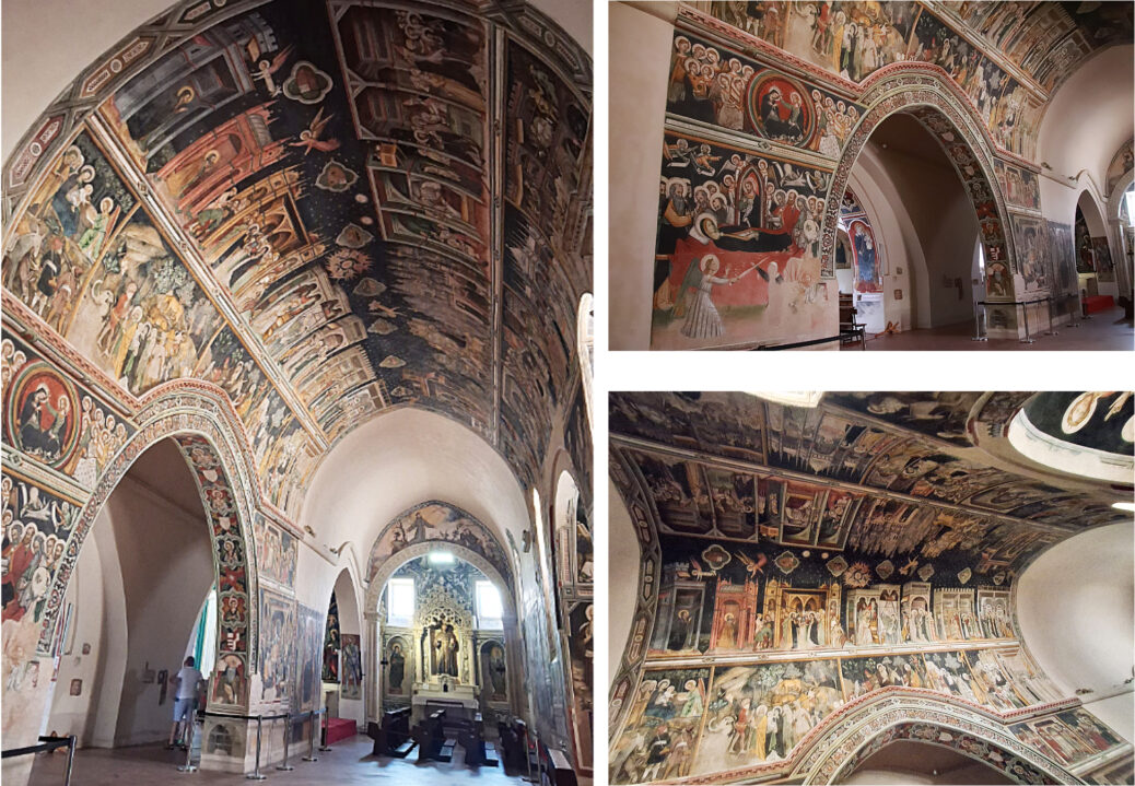 El interior está completamente recubierto de frescos del siglo XV, obra de varios autores (entre ellos, Franciscus De Arecio), con escenas del Antiguo y del Nuevo Testamento. Aquí vemos imágenes de la nave central