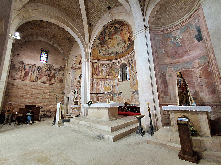 El interior, está dividido en tres naves con pilares y arcos apuntados, los tres ábsides albergan un magnifico ciclo de frescos medievales.