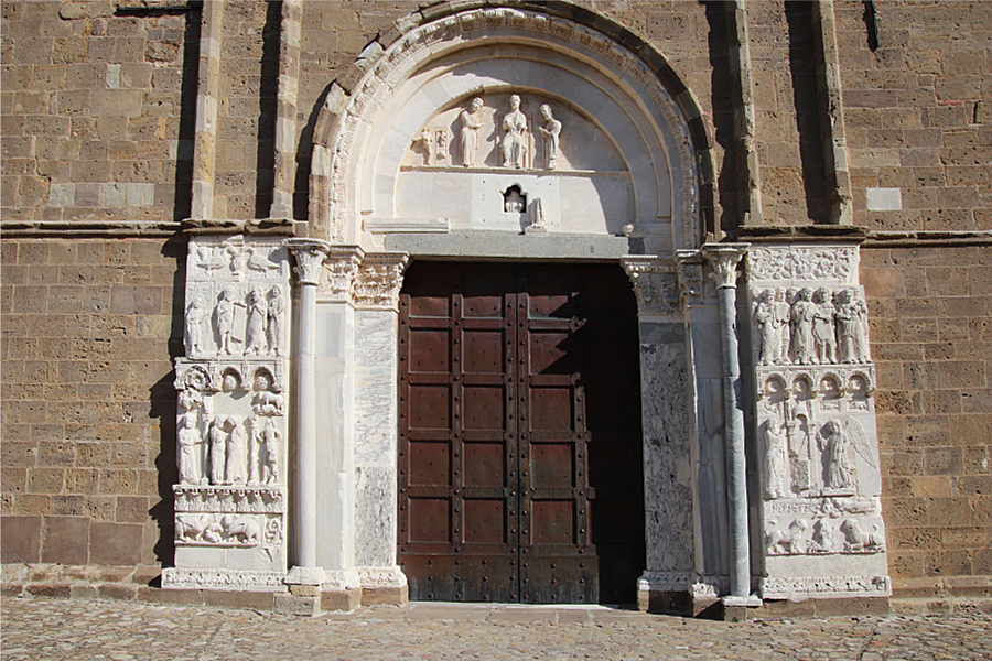 En la fachada, la puerta que da acceso a la nave central presenta el típico pórtico soportado por dos columnas que se apoyan en sendos leones. Sobre el dintel, aparece representado Cristo (con tamaño jerárquico) con seis apóstoles a cada lado.